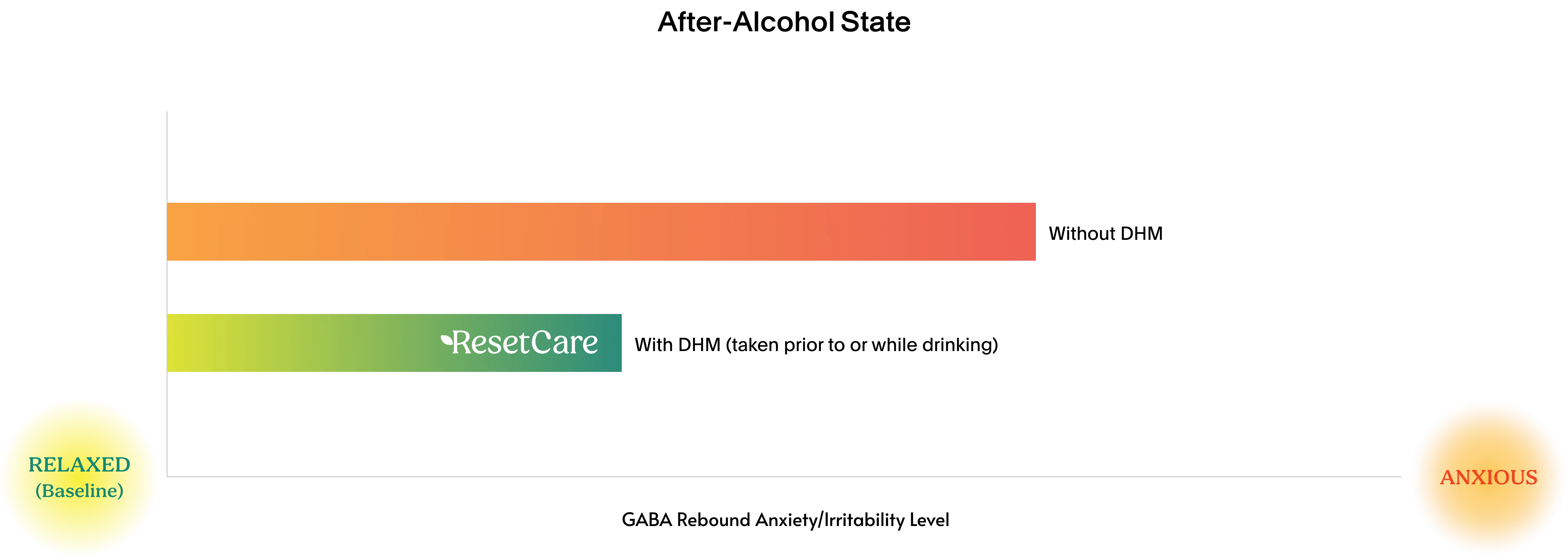 When we drink alcohol, it attaches to GABA receptors in our brain, activating GABA-related activity. This increased activity makes us feel calm and relaxed while drinking. However, once we stop drinking, our GABA receptors experience withdrawal (known as GABA receptor plasticity), causing feelings of anxiety and irritability the next day.4 The DHM in Revival Shot helps soothe these feelings by assisting in counteracting the withdrawal effects on GABA receptors.3,5 Therefore, Revival Shot can help reduce the anxiety and irritability that often follow drinking.
