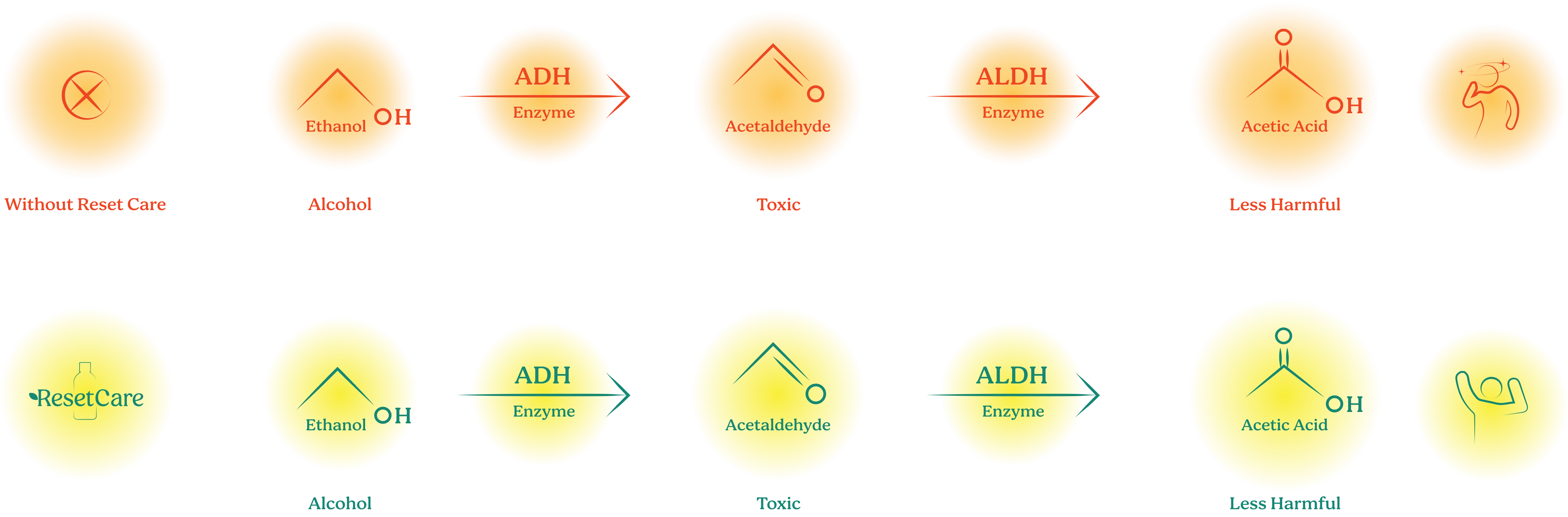 Figure 1. DHM in Reset Care’s Revival Shot can help increase the activity of the two key enzymes, alcohol dehydrogenase (ADH) and acetaldehyde dehydrogenase (ALDH), involved in the breakdown of alcohol.3